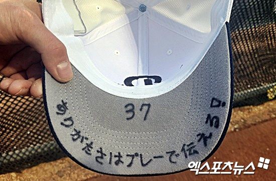 박지훈의 모자에는 특별한 문구가 새겨져 있다. 등번호 37번과 함께 '고마움은 플레이로 전한다'라는 일본어로 적힌 문구였다.