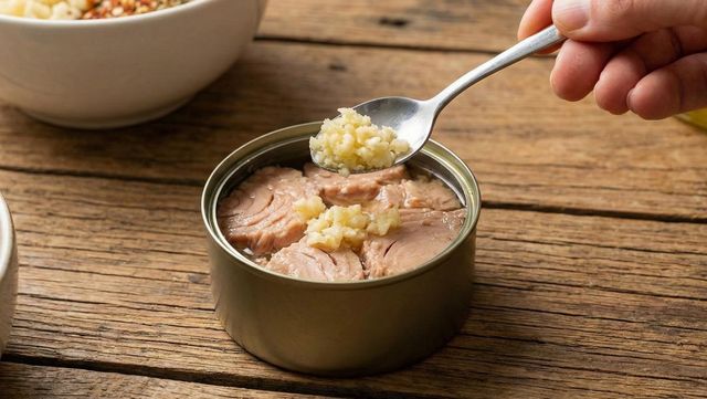 캔 참치에 다진 마늘을 얹는 모습(AI로 제작됨)