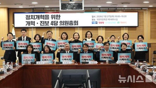 뉴시스 보도에 따르면, 조국혁신당·진보당·기본소득당·사회민주당 등 4당은 이날 오전 국회 의원회관에서 '정치개혁 개혁 진보 4당 의원총회'를 열었다.