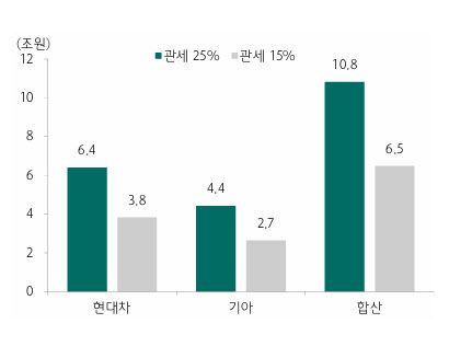 만약 트럼프 대통령 말대로 대미 자동차 수출 관세가 15%에서 25%로 오르면 손실폭은 더욱 커진다. 하나증권에 따르면 현대차·기아 합산 연간 관세 손실액은 15% 적용시 6조5000억원인데, 25% 적용시 10조8000억원으로 뛴다. 현대차그룹은 올해 미국 시장 점유율을 현 11~12%대에서 더 상향해 잡은 것으로 알려졌다. 특히 트럼프 대통령이 일본과 유럽연합(EU)에 대한 관세 상향을 언급하지 않았기 때문에 이대로라면 토요타, 폭스바겐보다 훨씬 더 불리한 조건에서 경쟁하게 된다.