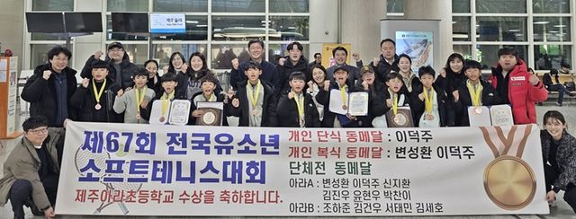27일 제주특별자치도 소프트테니스협회에 따르면 제주 아라초는 지난 14일부터 19일까지 전북 순창군에서 열린 제67회 유소년 전국소프트테니스대회에서 단체전에서 동메달 2개, 5학년 이하 개인복식에 동메달 2개를 획득했다.