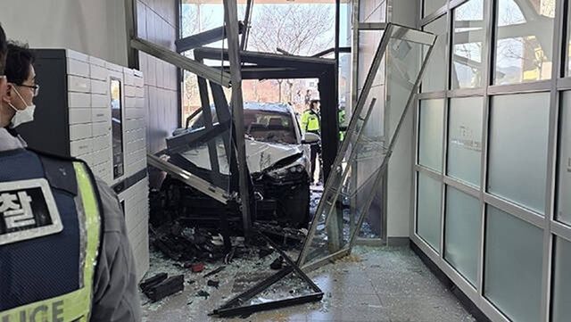 경북소방본부와 김천경찰서에 따르면 이날 오후 12시 57분쯤 김천시 율곡동 김천시립율곡도서관 1층으로 투싼 SUV가 돌진했다. 차량은 건물 출입구 유리문을 뚫고 내부까지 진입했으며, 당시 관내에서 작업 중이던 50대 남성 2명이 부상을 입었다.