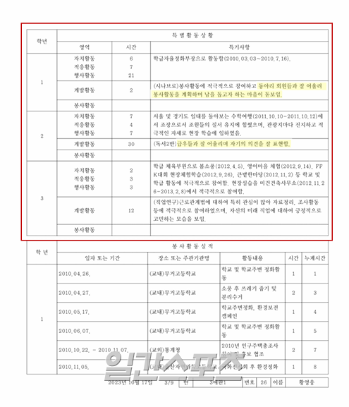 A 대표는 이같은 입장과 함께 황영웅의 학창시절 생활기록부도 공개했다. 이에 따르면 황영웅은 학창시절 학급자율정화부장으로 활동했고, 봉사활동에도 적극 참여했다. 또 수학여행 조장으로 조원들의 질서 유지에 힘썼다는 내용을 비롯해 고등학교 시절 학교 및 학교 주변 정화활동 등 봉사활동에 참여하기도 했다.