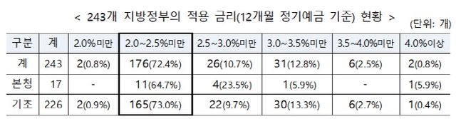 226개 기초 지방정부의 금리 평균은 2.52%다. 인천광역시 서구가 4.82%로 최고치를, 경기도 양평군이 1.78%로 최저치를 기록했다.