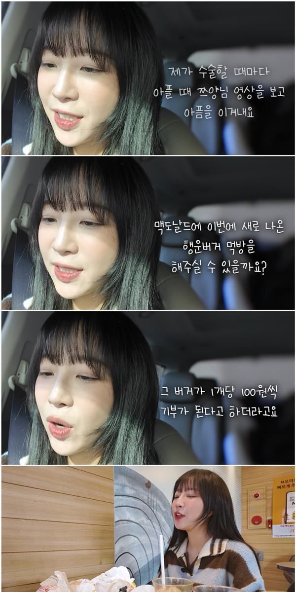 해당 영상에 따르면 최근 쯔양에게 자신을 13살 구독자라고 밝힌 한 어린이가 사연을 남겼다. 이 어린이는 수술할 때마다 아플 때 쯔양의 영상을 보며 버텼다며 행운버거 먹방을 요청했다. 해당 버거는 1개당 100원씩 기부되는 상품으로, 자신과 비슷하게 아픈 아이들이 빨리 나았으면 좋겠다는 바람도 더했다. 해당 댓글은 온라인에서 빠르게 확산했다.