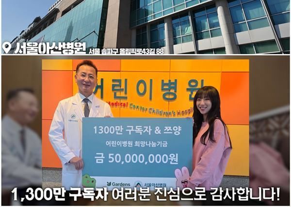 기부금 5000만 원은 구독자의 이름으로 서울아산병원 어린이병원 희망나눔기금에 전달됐다. 해당 기금은 어린이 환자 치료와 연구, 의료 및 시설 보완은 물론 치료로 학업이 중단된 아이들을 위한 병원학교 운영에도 사용된다.