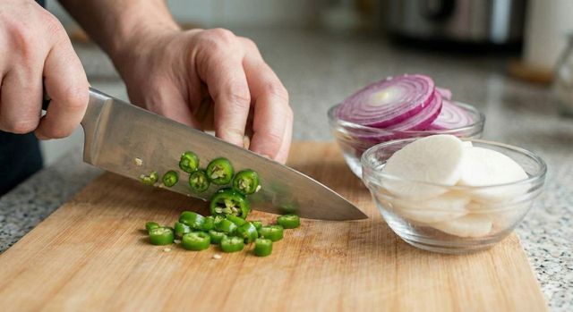 양파와 고추, 무를 써는 모습 (AI로 제작됨)