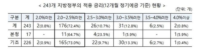 전국 243개 지방정부의 금고 이자율을 조사한 결과, 12개월 이상 정기예금 금리는 전국 평균 2.53%(공개 이자율 기준)로 집계됐다.