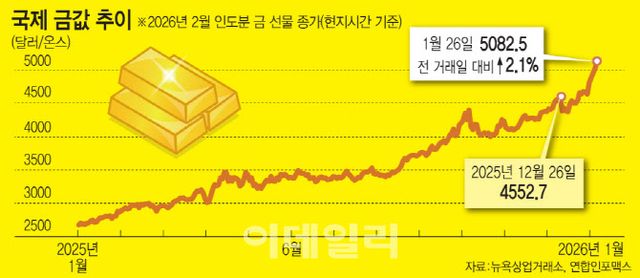 하지만 금값 랠리가 모든 것을 바꿨다. 2023년 말 온스당 2000달러, 2024년 말 2600달러 수준이었던 국제 금값은 전날 사상 처음으로 온스당 5000달러를 돌파했다. 지정학적 위기 고조에 따른 안전자산 선호 확산, 연방준비제도(Fed·연준)의 금리 인하와 달러화 약세, 각국 중앙은행의 매입 확대 등이 맞물려 최근 2년 동안 금값은 두 배 이상 폭등했다.