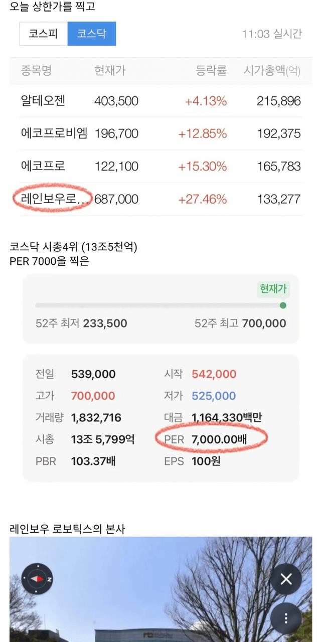 PER 7000배라는 경이로운 수치를 기록해서 최근화제가되었던 코스닥 시총3위 기업인 레인보우 로보틱스