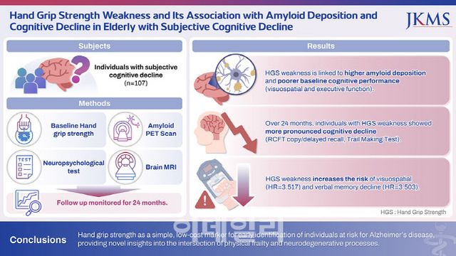 연구진은 “이번 연구는 주관적 인지 저하를 겪는 노인에서 악력 약화가 아밀로이드 침착과 인지 기능 저하를 반영하는 잠재적 지표가 될 수 있음을 시사한다”고 설명했다.