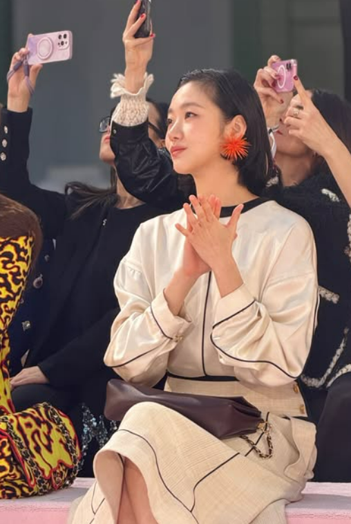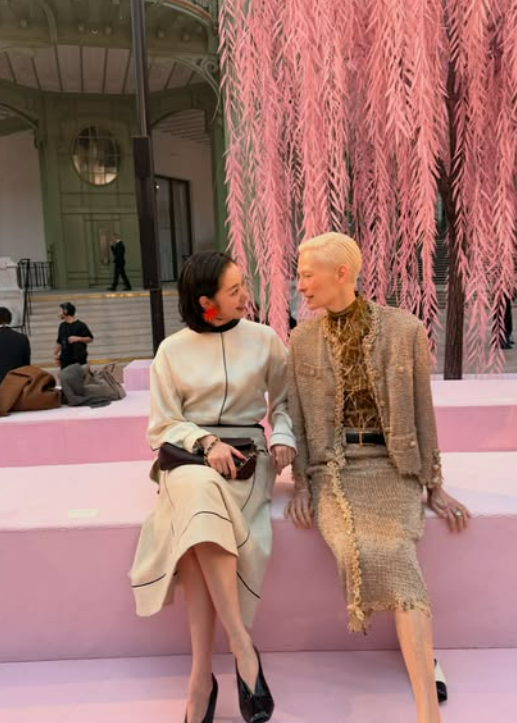 사진 속 김고은은 파리 패션위크 현장에서 할리우드 배우 틸다 스윈튼과 나란히 앉아 대화를 나누는 모습이다. 그는 화이트 톤의 셋업 의상에 레드 오렌지색 귀걸이를 착용해 현장 분위기에 녹아들었다.