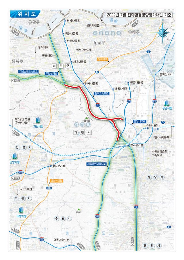 사업 구간은 경부고속도로와 용인서울고속도로가 만나는 판교 인근부터 서초구 우면산터널까지 약 10.7㎞이며, 왕복 4차로 규모로 조성한다.