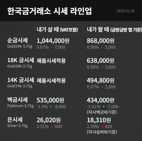 [투어코리아=이지환 기자] 한국금거래소 1월 28일 기준 24K 금시세는 내가 살 때 3.75g당 1,044,000원으로, 전일 대비 7,000원(0.67%) 상승했다.