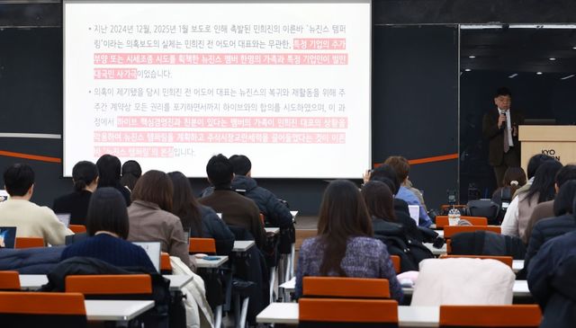 28일 오후 1시 서울 종로구 교원종각빌딩 챌린지홀에서 '민희진 전 어도어 대표 탬퍼링 진실과 다보링크 주식시장 교란 사건–K팝 파괴자와 시장 교란 방조자는 누구인가'를 주제로 기자회견이 열렸다.