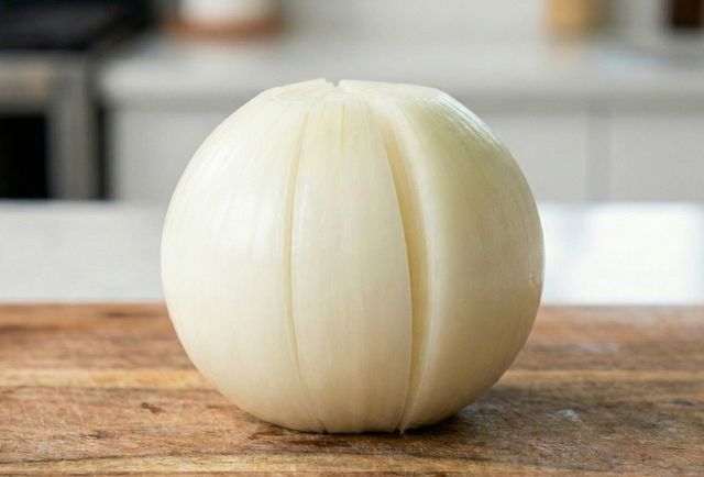 양파를 만두피처럼 활용하기 위해 심지 가깝게 세로로 칼집을 두 번 내준다. AI툴로 생성한 자료사진.