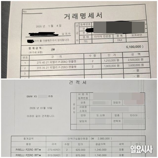 [일요시사 취재2팀] 김준혁 기자 = 자동차 정비 서비스는 업체별 책정 기준이 제각각이라 소비자 입장에선 적정가를 판단하기란 쉽지 않다. 최근 한 차주가 타이어 4짝 교체에 610만원을 결제했다는 사연이 알려져 논란이 일고 있다.