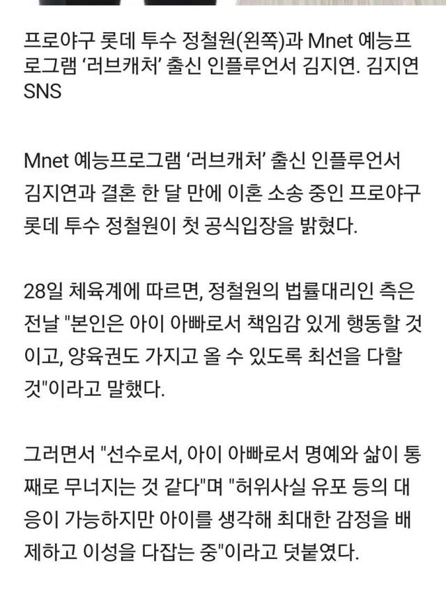 정철원의 법률대리인 법무법인 대련 관계자는 27일 뉴시스와 통화에서 "정철원 선수는 김지연이 이혼 소송의 상대방이기 전에 아이의 엄마이기 때문에 허위사실 유포, 아이의 양육과 관련된 형사 고소로 대응할 수 있음에도 불구하고 아이를 생각하며 현재 최대한 감정을 배제하고 이성을 다잡고 있다"고 전했다.