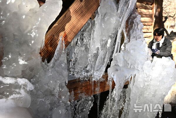 [서울=뉴시스] 전국 곳곳에 한파특보가 발효된 28일 경기 용인시 한국민속촌에 설치된 물레방아가 꽁꽁 얼어 있다.