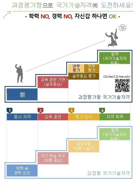 또한, 교육·훈련을 통해 실무 역량을 키워나가는 만큼 별도의 응시자격을 먼저 요구하지 않아 경력이 없는 사람이나 비전공자도 산업기사 이상 자격에 도전할 수 있다. 과정평가형 국가기술자격을 취득하기 위해서는 직업계고, 대학, 폴리텍 등 교육기관에서 개설되는 과정에 참여하거나, 직업훈련기관에서 국민내일배움카드로 교육·훈련을 신청하여 수강할 수 있다.