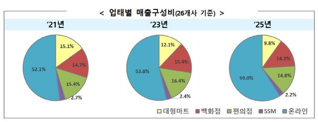 온·오프라인 업체 간 성장 격차가 이어지면서, 이들 26개사 기준 온라인 매출 비중도 2020년엔 절반 이하(48.2%)였으나 지난해는 59.0%에 이르렀다.