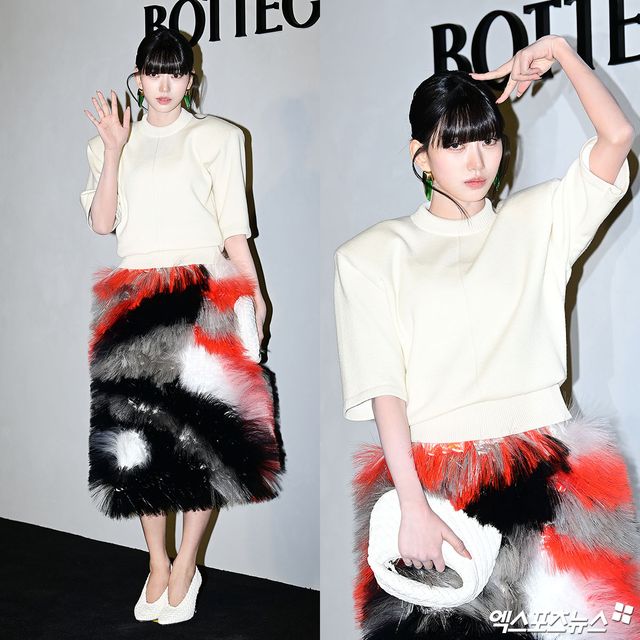 이날 행사에 참석한 수인은 화려한 멀티 컬러의 퍼 스커트를 착용해 시선을 사로잡았다. 레드, 블랙, 화이트가 강렬하게 배색된 풍성한 텍스처의 스커트는 수인의 슬림한 실루엣과 대비를 이루며 드라마틱한 효과를 극대화했다.