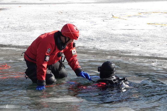 구조대원은 ▲소방헬기를 활용한 빙상 인명구조 ▲장비를 이용한 얼음절삭 ▲수중드론을 활용한 인명검색 ▲얼음 밑에서의 인명구조 등 사고 발생 시 신속한 상황 판단과 역할 분담을 통해 효율적인 구조 활동이 이뤄질 수 있도록 훈련했다.