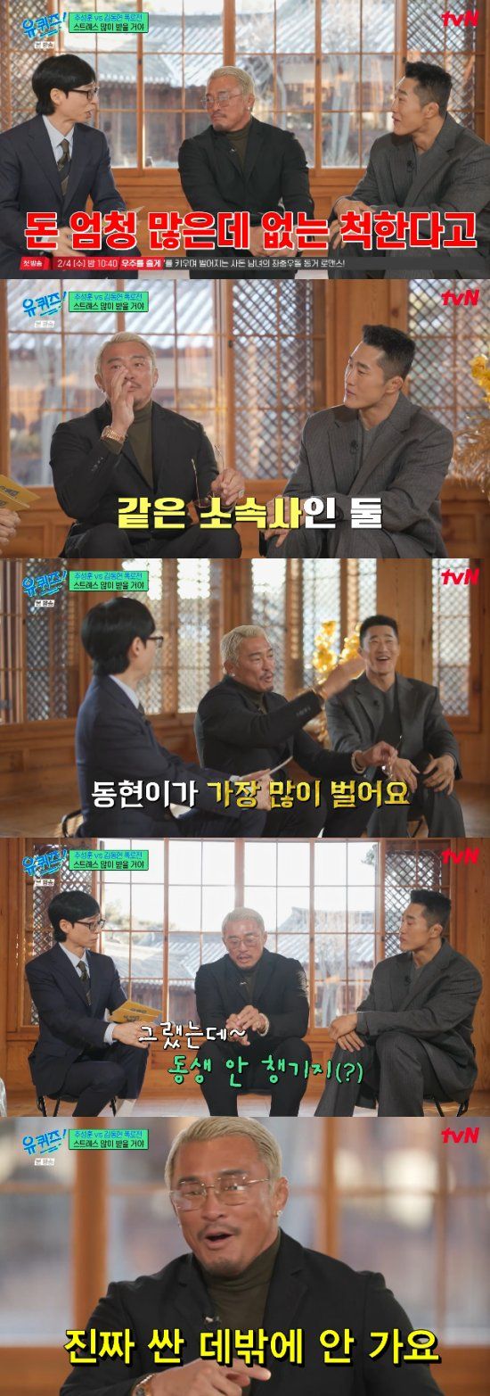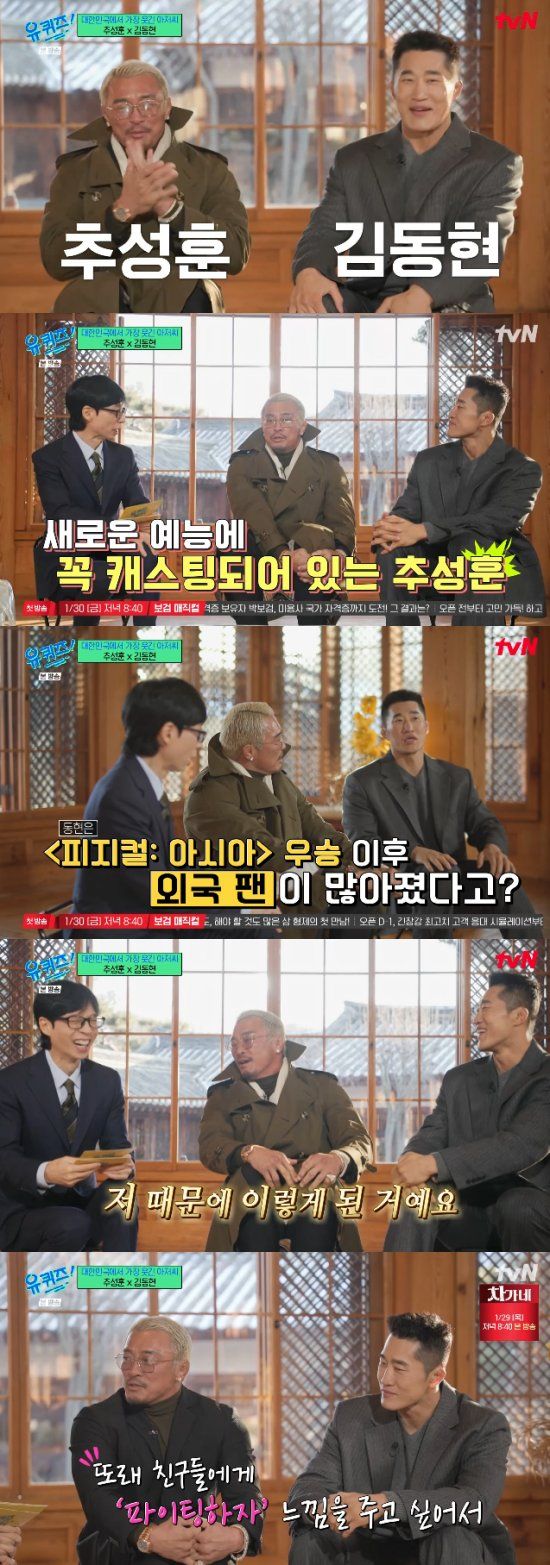 28일 방송된 tvN 예능 프로그램 '유 퀴즈 온 더 블럭'에서는 이종격투기 선수 겸 방송인 추성훈, 김동현이 출연해 이야기를 나눴다.