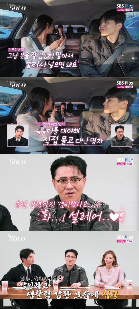 따뜻한 옷도 챙겨왔냐는 질문에 영자는 "패딩까지 야무지게 챙겼다. 압축도 하나도 안 했다. 잘 꼼꼼히 말아서 눌러서 넣으면 된다. 올라타서 닫으면 된다"고 말했다. 영식은 "뭔가 생활력 있는 것 같다"며 놀라워했다.