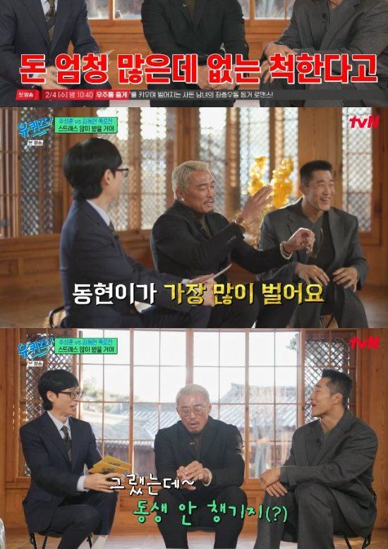 김동현의 공격에 추성훈 역시 "김동현도 유튜브에서는 동생들을 잘 챙기는 것처럼 보이지만 안 챙긴다. 그리고 돈도 엄청 많으면서 없는 척을 한다. 같은 소속사니까 얼마를 버는지 아는데, 동현이가 제일 많이 번다"고 말해 김동현을 당황시켰다.