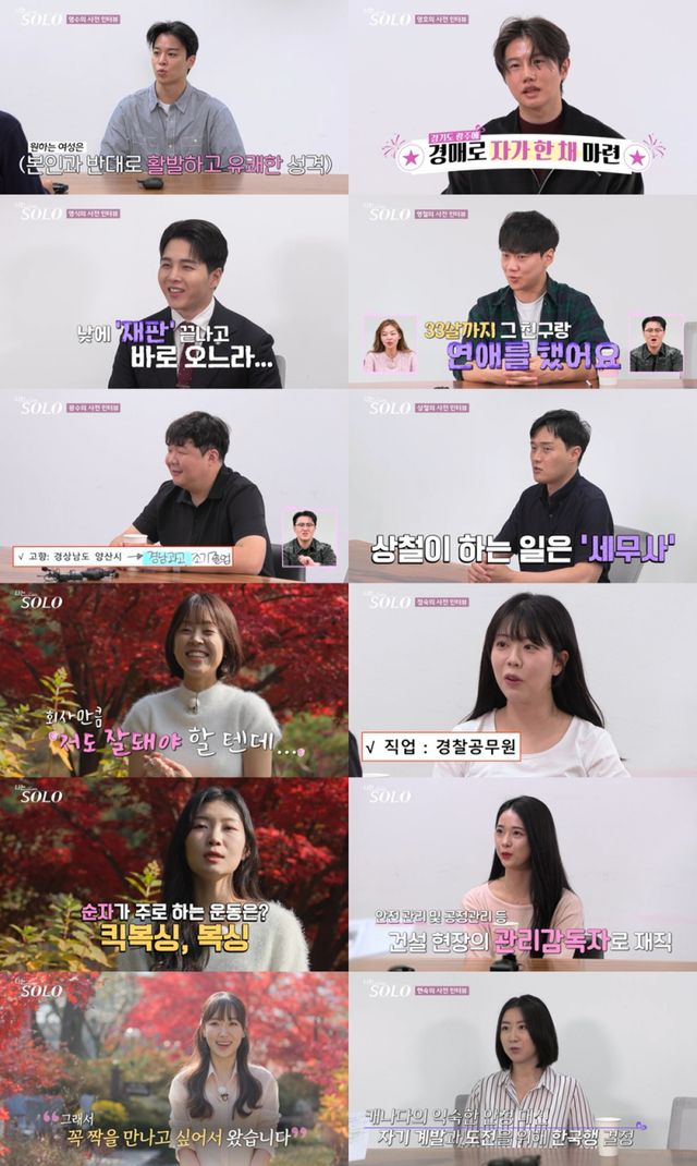 반면 솔로녀들은 시원시원하고 쿨한 등장으로 시작부터 발랄한 매력을 발산했다. 영숙은 유명한 제약사 브랜드 매니저였고, “타깃(관심 있는 상대)을 정하면 딱!”이라고 ‘직진녀’임을 알렸다. 하이힐을 신고 다부진 팔자걸음으로 등장한 정숙은 경찰이라는 직업과 함께 “제가 센 성 격이라 센 분들이랑 안 맞는다. 잘생긴 남자도 별로…”라고 이상형을 설명했다. 이름이 적힌 족자를 맨손으로 끊어버린 순자는 킥복싱, 복싱 등을 즐기는 ‘리얼 테토녀’였고, “절 어필해서 혼인관계증명서의 공란을 채워보겠다”는 각오를 전했다. ‘아이유 닮은꼴’ 영자는 18기 영호의 회사 후배로, 대형 건설사의 현장 관리 감독자로 재직 중이었다. 귀여운 얼굴과 달리 캐리어도 혼자 번쩍 드는 영자는 “소개팅도 100번 넘게 한 거 같은데 사람 만나기가 쉽지 않다”며 ‘순환 근무’의 고충을 토로했다.
