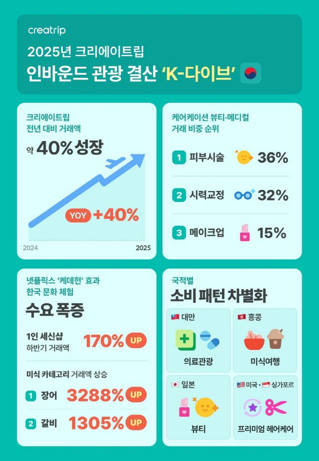 크리에이트립에 따르면 데이터에 따르면 지난해 외국인 관광객의 한국 여행은 한국인의 일상을 경험하는 ‘K-다이브(K-Dive)’ 형태를 나타냈다. 여행 패턴은 한국인의 일상을 따라 하는 ‘데일리케이션’에서 자기관리에 집중하는 ‘케어케이션’으로 확장됐다. 이에 따라 외국인 관광객 사이에서 한방 치료, 건강검진 등 K-웰니스 기반 상품에 대한 수요도 증가한 것으로 집계됐다.