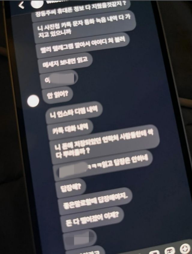 장동주는 장문의 글과 함께 해킹범으로 추정되는 인물과 나눈 메시지 일부를 공개했다. 공개된 사진 속 메시지에는 "휴대폰 정보 다 지웠을 것 같지?", "사진첩 카톡, 문자, 통화 녹음 내역 다 가지고 있다", "텔레그램 깔고 아이디 보내라" 등의 협박성 문구와 욕설이 담겼다.