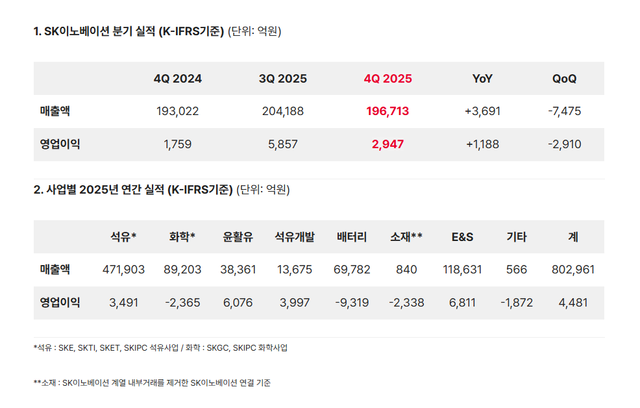 SK이노베이션이 2025년 연간 매출 80조 2961억 원, 영업이익 4481억 원을 기록한 가운데 배터리 사업의 대규모 자산 손상 인식 영향으로 4분기 세전 손실이 4조 원대를 기록했으나 정제 마진(원유 가격과 제품 가격의 차이) 개선과 윤활유 사업의 견조한 실적에 힘입어 본업의 수익성을 확인하며 재무 구조 안정화와 전기화 전략 추진을 위한 기반을 마련했다.