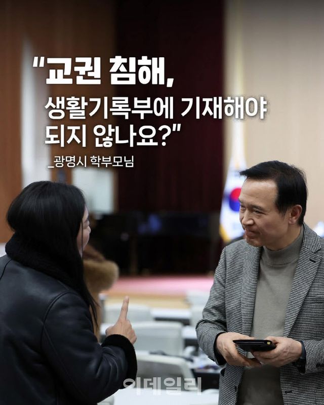 임 교육감은 ‘교권 침해, 생활기록부에 기재해야 되지 않냐’는 이날 만난 광명시 학부모의 말을 소개하면서 “처벌만으로 끝난다면 잘못된 행위가 반복될 수 있으니, 생기부 기재를 통해 교권을 강화해야 한다는 조언이었다”고 설명했다.