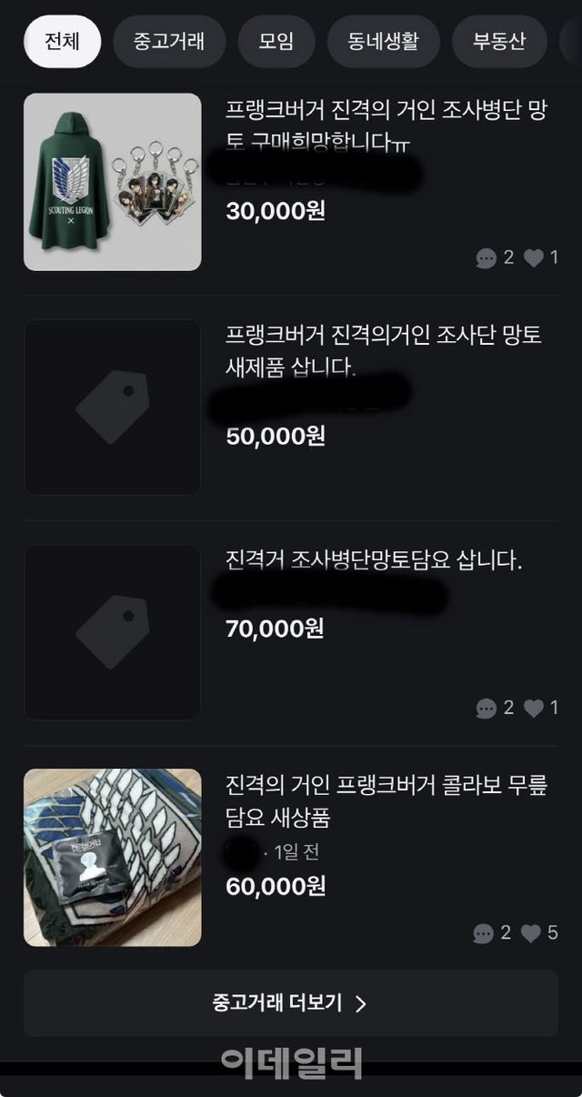 29일 업계에 따르면 최근 프랭크버거는 애니메이션 ‘진격의 거인’과 손잡고 콜라보 세트를 출시했다. 지난 22일 출시한 ‘조사병단 담요팩’ 가격은 2만 2300원. 일반적인 햄버거 세트 가격을 훌쩍 뛰어넘지만, 판매 시작과 동시에 전국 매장에서 품절 대란이 일어났다. 이유는 햄버거가 아닌, 함께 증정되는 망토 담요에 있었다. 현재 중고 거래 플랫폼 당근마켓 등에서는 이 망토가 포함된 세트 굿즈가 정가의 약 3배인 6만원대에 거래되고 있다. 소비자들은 햄버거의 맛을 소비하는 것이 아니라, 자신이 좋아하는 콘텐츠를 소유하기 위한 입장권으로 햄버거를 구매하는 셈이다.