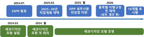 기후부에 따르면, EU는 2020년부터 신순환경제계획을 발표하면서 EU 역내에서 유통되는 모든 제품별로 설계기준과 필요한 정보제공을 강제할 수 있는 규정을 마련했다. 이에 따라 2024년 7월 ESPR을 발표하고 이듬해 3월 2030년까지 적용될 품목별 작업계획(세부규정)을 정리했다. 이 내용은 우리나라의 시행령 또는 시행규칙과 같은 품목별 위임법에 따라 강제력을 갖게 된다. EU는 에너지사용제품·섬유·가구 등 품목별 우선순위를 부여해 위임법의 제정계획을 발표했으며 올해부터 품목별 채택이 하나씩 이뤄질 전망이다. 규제 발효는 위임법 채택일로부터 18개월 후 시작된다.