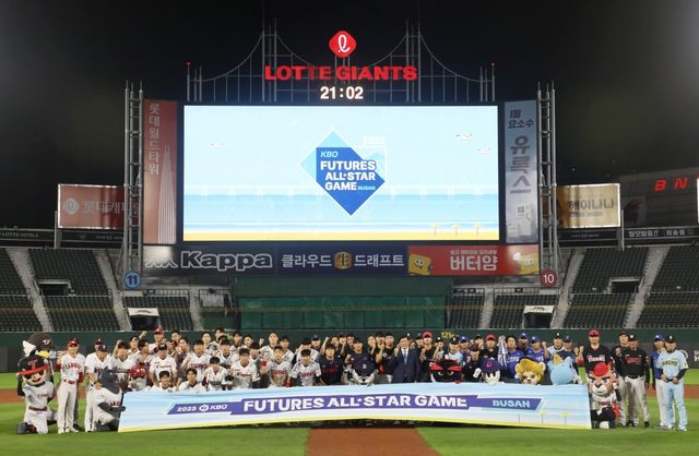 2023년 7월 14일 오후 부산 사직야구장에서 열린 '2023 KBO 퓨처스 올스타전' 북부리그와 남부리그의 경기가 끝난 후 선수들이 기념촬영을 하고 있다. / 뉴스1