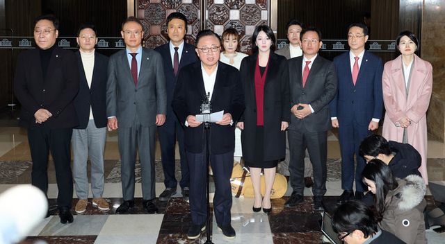 국민의힘 친한(친한동훈)계 의원 16명이 한동훈 전 대표 제명을 주도한 장동혁 대표 체제 지도부의 즉각 사퇴를 요구했다. © 연합뉴스