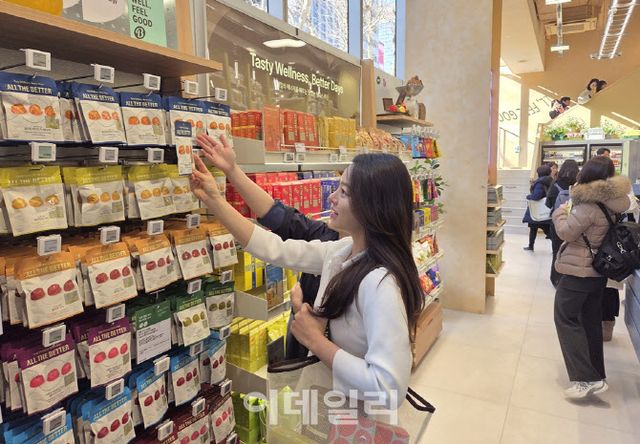 실제로 직접 방문한 매장은 기존 올리브영과 결이 확 달랐다. 1층에는 저당 단백질 음료, 기능성 요거트, 숙면을 돕는 릴렉싱 티 등 식품과 건강기능식품의 경계를 허문 제품들이 냉장 진열대를 채웠다. 단순 보충제 판매를 넘어, 일상 속 섭취 루틴을 제안하는 구성이다. 루틴별로 구획된 동선 역시 사용 목적에 따라 자연스럽게 쇼핑 흐름을 유도하는 점이 눈에 띄었다.