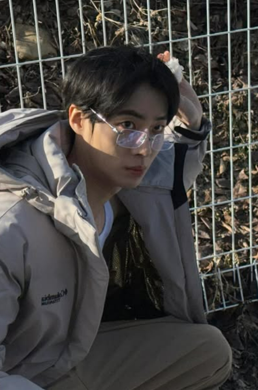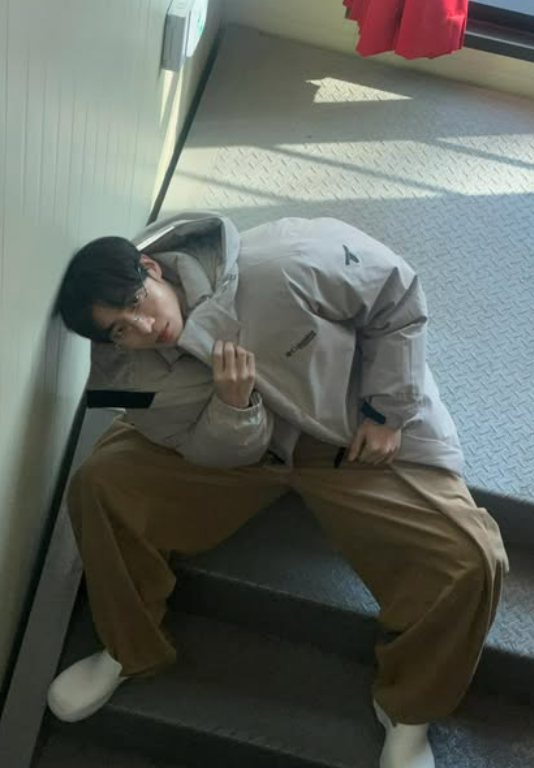 또 다른 사진에서는 대기실 문 앞에 서서 지적인 비주얼을 뽐냈다. ‘연애박사 박민재 역 추영우 배우님’이라는 이름표가 붙은 문에 기대어 아래를 응시하는 모습은 앞서 보여준 장난꾸러기 같은 모습과는 180도 다른 진지한 카리스마를 느끼게 한다. 특히 베이지 톤의 패딩과 팬츠를 매치한 감각적인 스타일링과 지적인 안경의 조화가 그의 뚜렷한 이목구비를 더욱 돋보이게 한다.