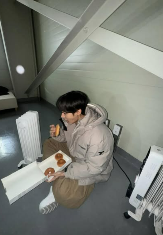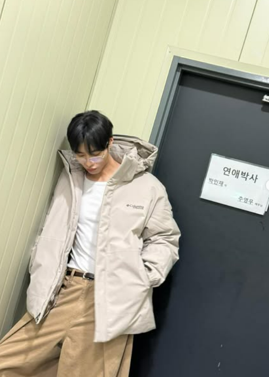 현장에서의 소탈한 모습도 포착됐다. 추영우는 대기실 바닥에 앉아 라디에이터 옆에서 도넛을 먹는가 하면, '연애박사 박민재 역 추영우'라는 이름표가 붙은 문 앞에서 인증샷을 남겼다.