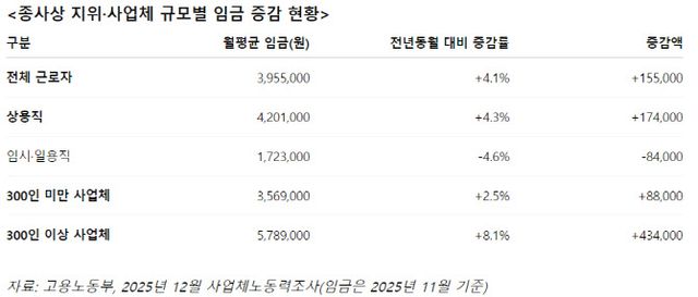 고용노동부가 29일 발표한 ‘2025년 12월 사업체노동력조사 결과’에 따르면 지난해 11월 기준 상용근로자 1인 이상 사업체의 근로자 1인당 월평균 명목임금 총액은 395만5000원으로 전년 동월 대비 4.1%(15만5000원) 증가했다. 다만 명목임금은 두 달 연속 감소하며 상승 흐름이 둔화되는 모습이다.