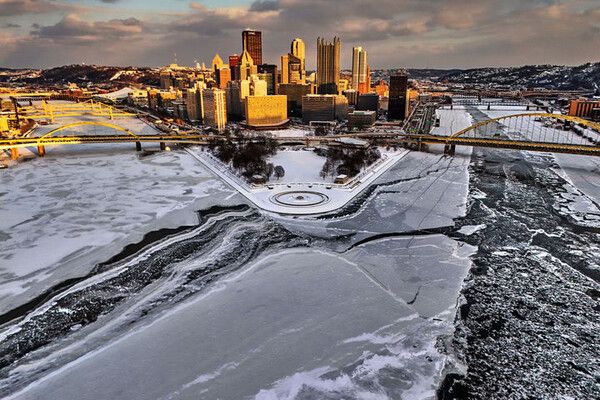 [서울=뉴시스] 28일(현지 시간) 미 펜실베이니아주 피츠버그 도심의 포인트 주립공원에서 앨러게니강(왼쪽부터), 오하이오강, 모논가힐라강이 합류하는 지점이 얼음으로 뒤덮여 있다.