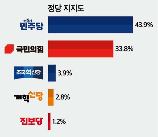 민주 43.9% 국힘 33.8% 조국혁신당 3.9% 개혁신당 2.8% 진보당 1.2%