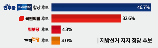 지방선거에서 어느 정당 후보를 지지하겠느냐는 질문에는 민주당·조국혁신당 합당 후보가 46.7%, 국민의힘 후보가 32.6%로 나타났다.