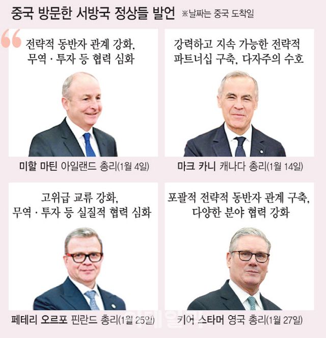 스타머 총리에 앞서 이달에만 미할 마틴 아일랜드 총리, 마크 카니 캐나다 총리, 페테리 오르포 핀란드 총리가 중국을 방문해 시 주석 등 중국 고위급과 만났다. 프리드리히 메르츠 독일 총리는 다음 달 중국을 찾을 예정이다. 에마뉘엘 마크롱 프랑스 대통령은 이미 지난달 중국을 다녀갔다.