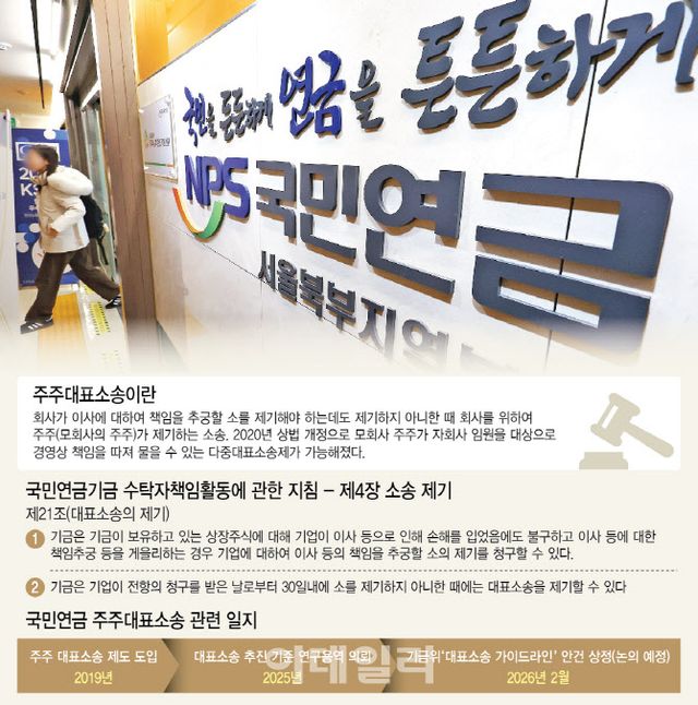 29일 이데일리 단독 취재에 따르면 국민연금은 다음달 열리는 ‘2026년 제2차 기금운용위원회’에서 ‘주주대표소송 가이드라인 상황 보고’ 안건을 다룰 예정이다. 주주대표소송 제도의 시행 기준을 공식 점검하는 안건으로, 이번 기금위 이후 주주대표소송에 본격적인 시동을 걸 것이라는 전망에 무게가 실린다.