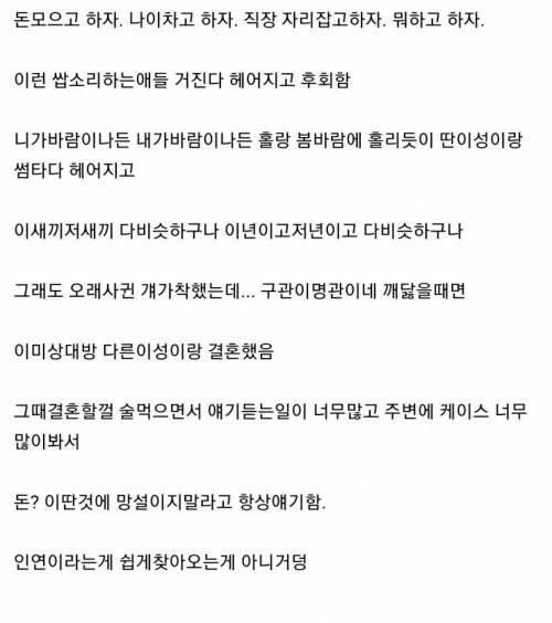 A씨는 "주변에 돈 모으고 하자, 자리 잡고 하자는 헛소리하다가 헤어지고 후회하는 애들이 수두룩하다"며 안타까움을 표했습니다. 특히 다른 이성을 만나보고 나서야 "구관이 명관이었다"는 사실을 깨달을 때는 이미 상대가 다른 사람의 배우자가 된 후라는 점을 강조했습니다.