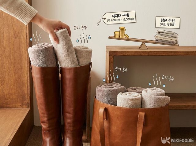 겨울이 끝나갈 무렵, 롱부츠와 가죽 가방 보관이 고민이 된다. 그대로 세워두면 주름이 생기고, 접어 두면 형태가 무너진다. 전용 지지대를 사자니 가격이 부담스럽다. 이때 수건이 역할을 대신한다.